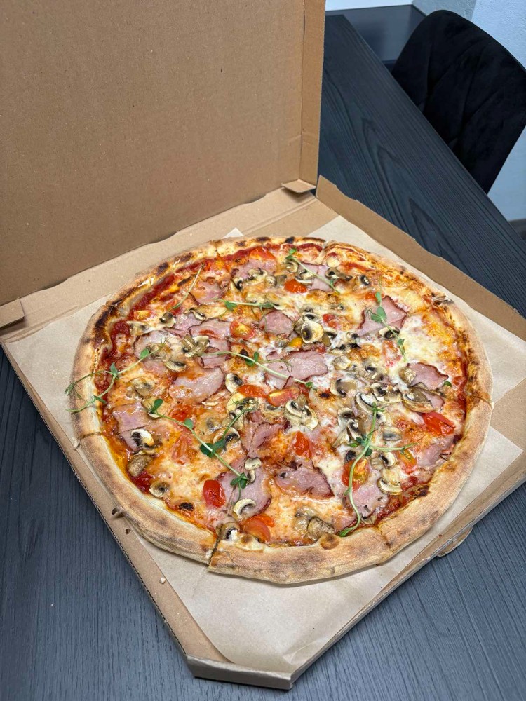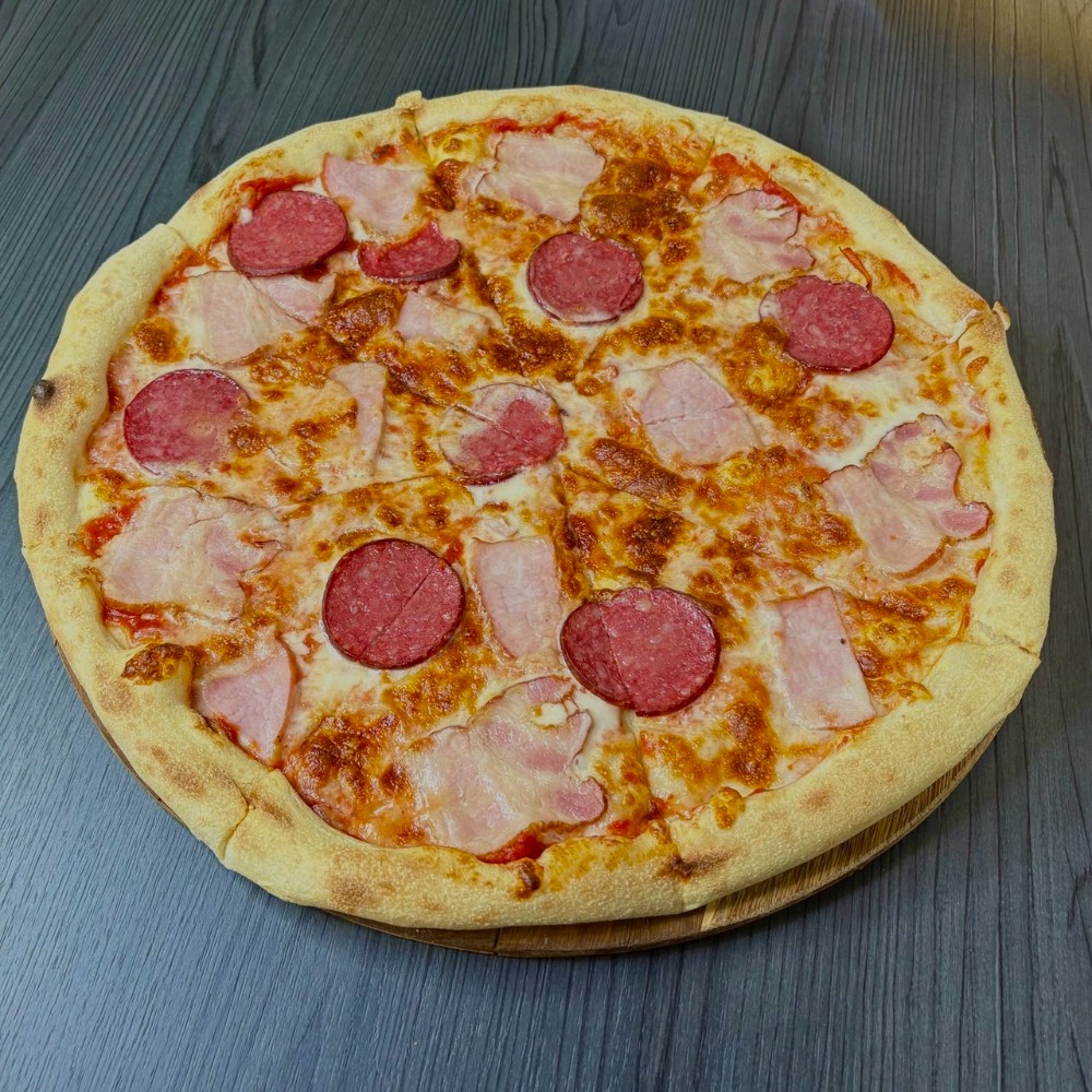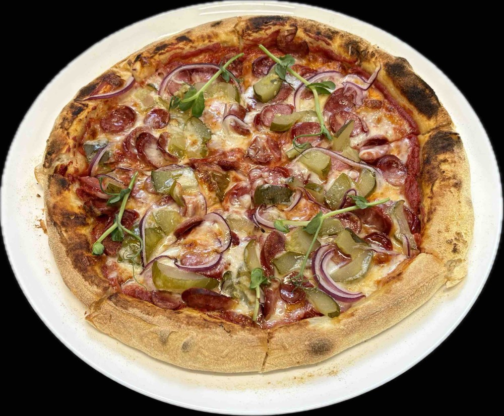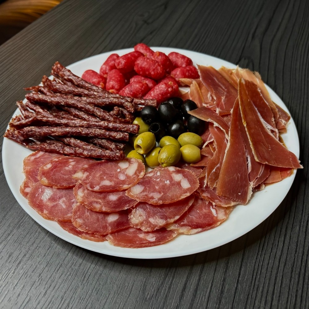 Склад: салямі, бекон, шинка, курка копчена, ковбаски мюнхенські, сало, картопля, морква, цибуля, маслини, огірки мариновані, томатна паста, олія оливкова, лимон, хліб, сало, сметана, гірчиця, кріп.