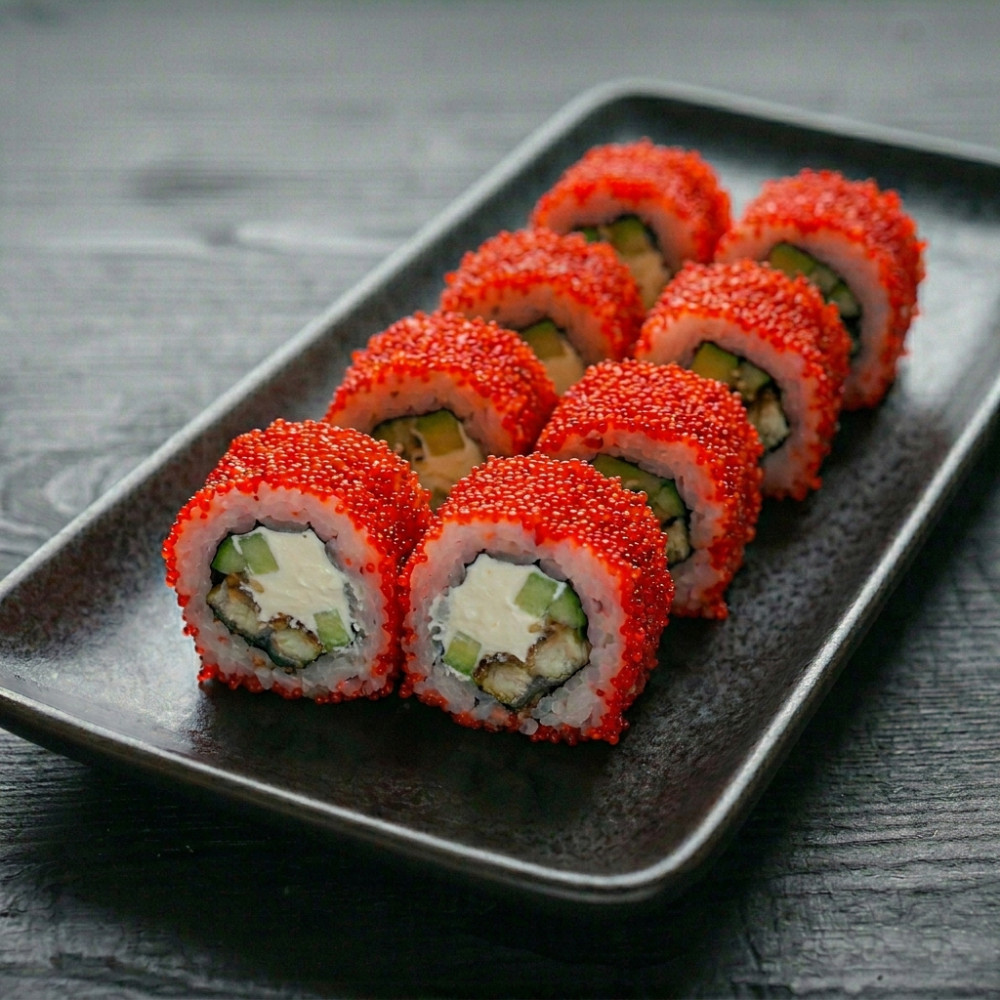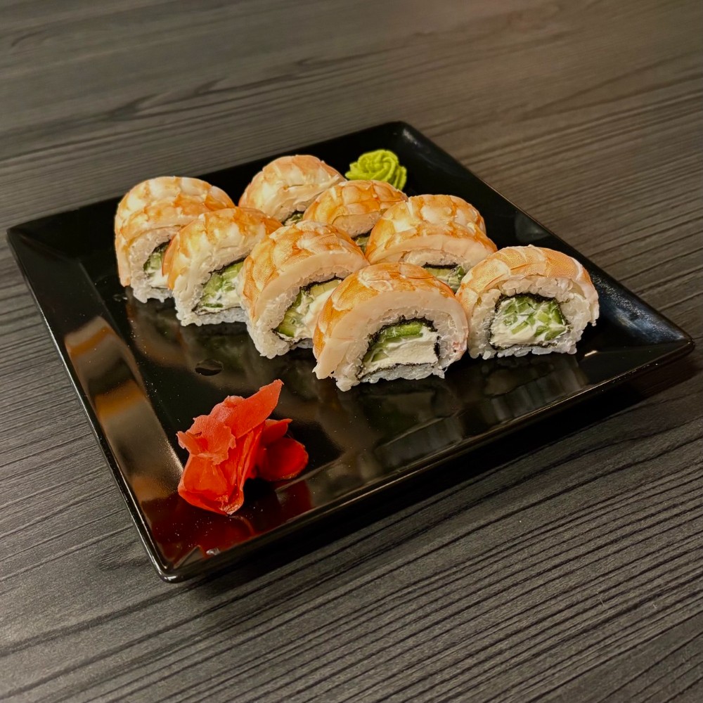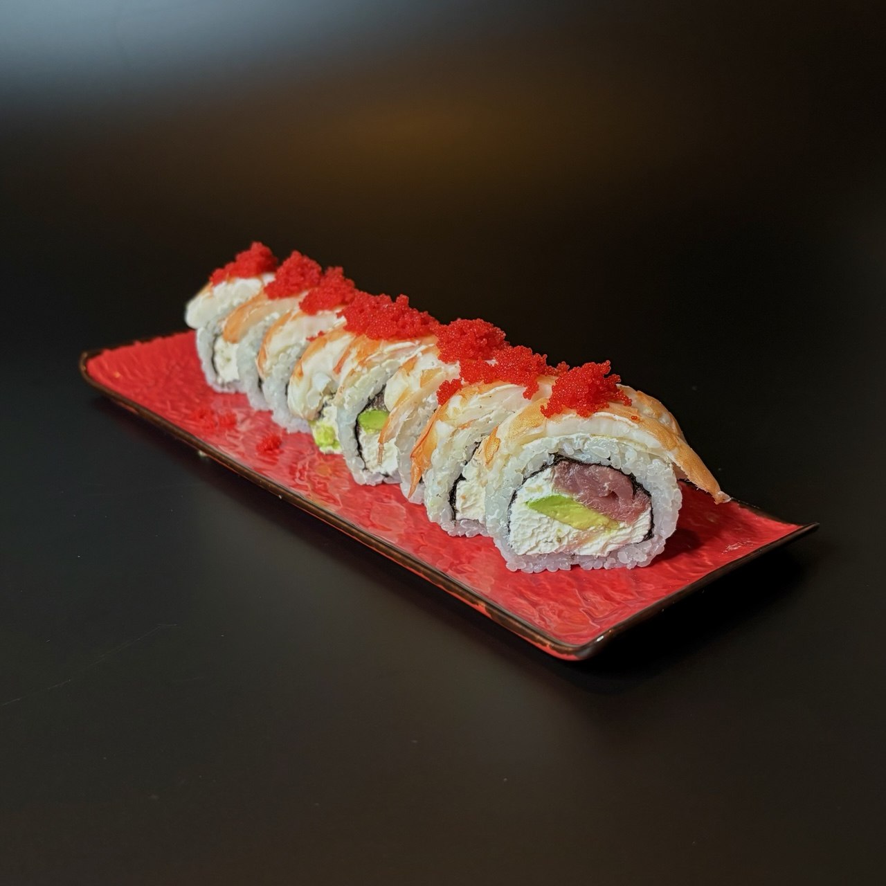 Склад: рис, лосось, креветка, вугор, норі, соус унагі, кунжут.