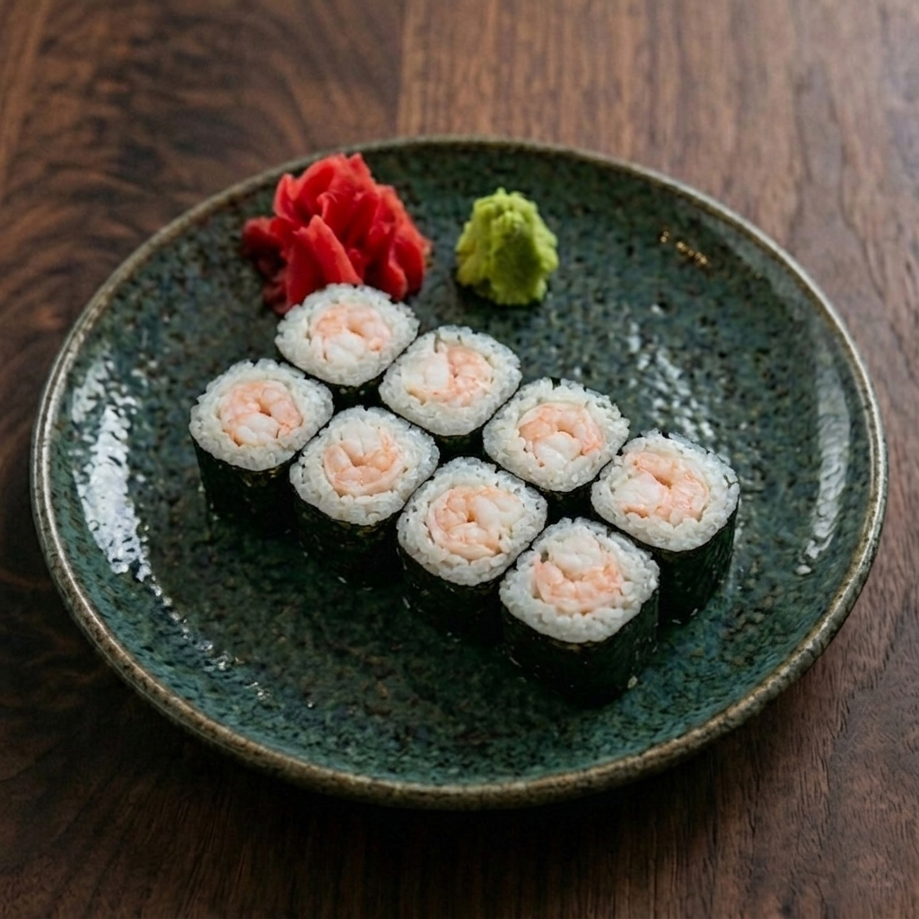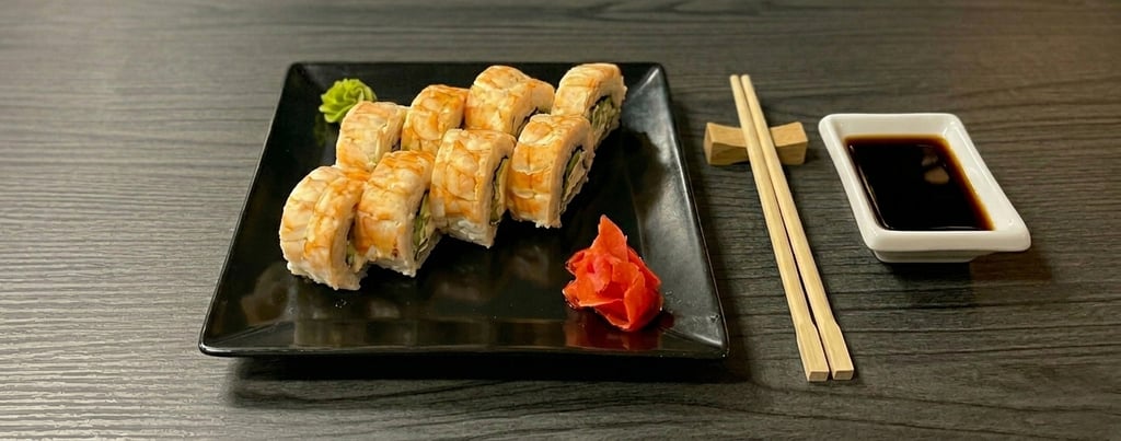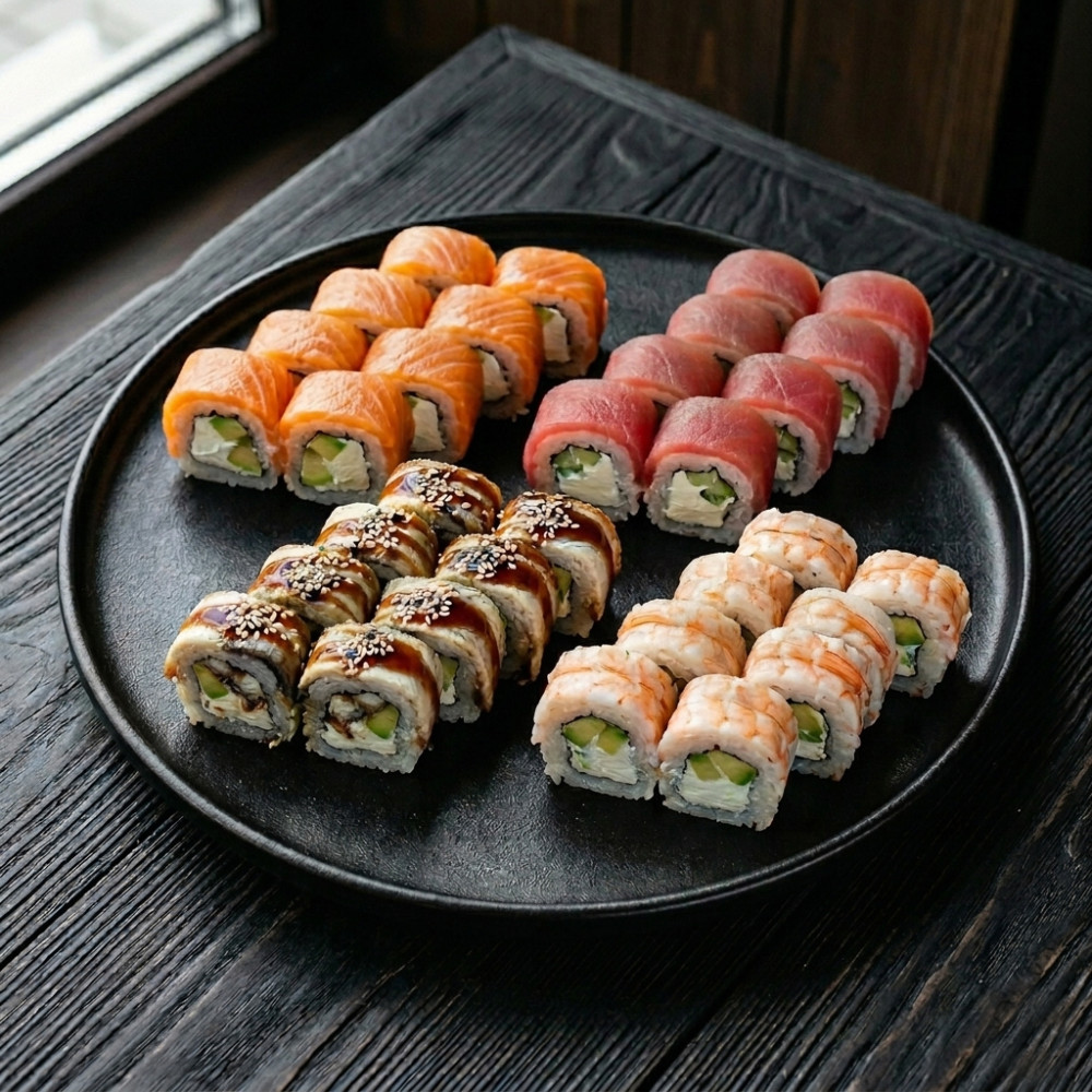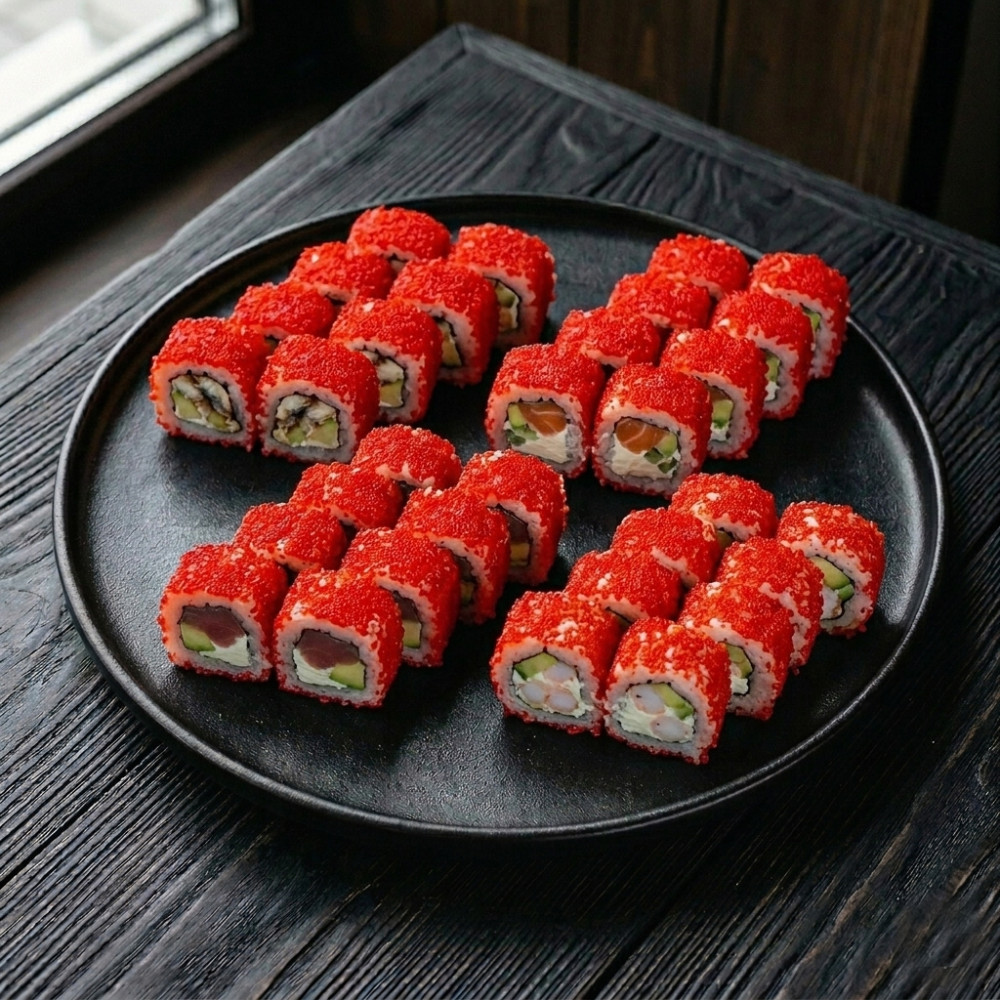 Склад: рис, лосось, креветка, вугор, норі, соус унагі, кунжут.