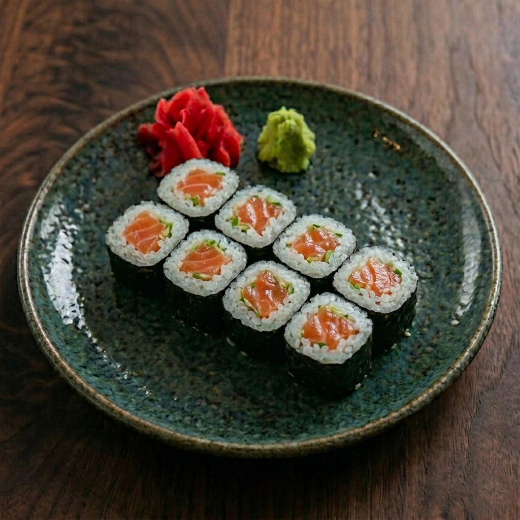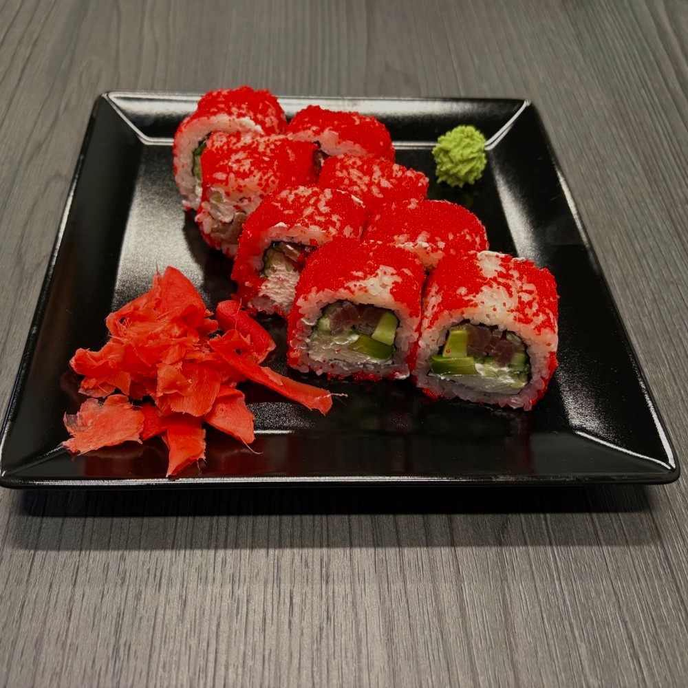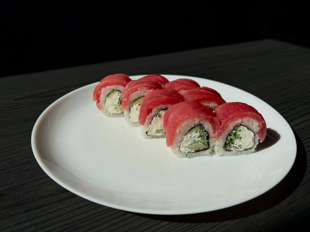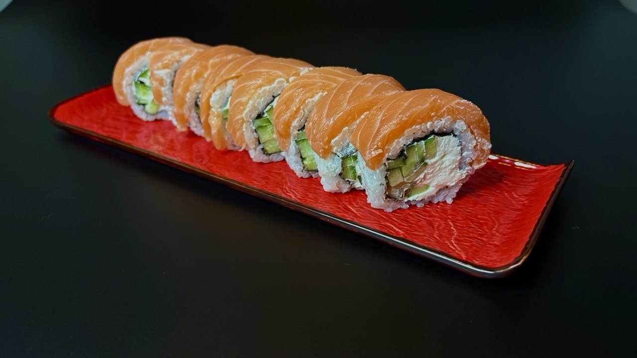 Склад: рис, лосось, авокадо, огірки, крем-сир, чука, соус соєвий, соус горіховий, мікс кунжуту, лимон.