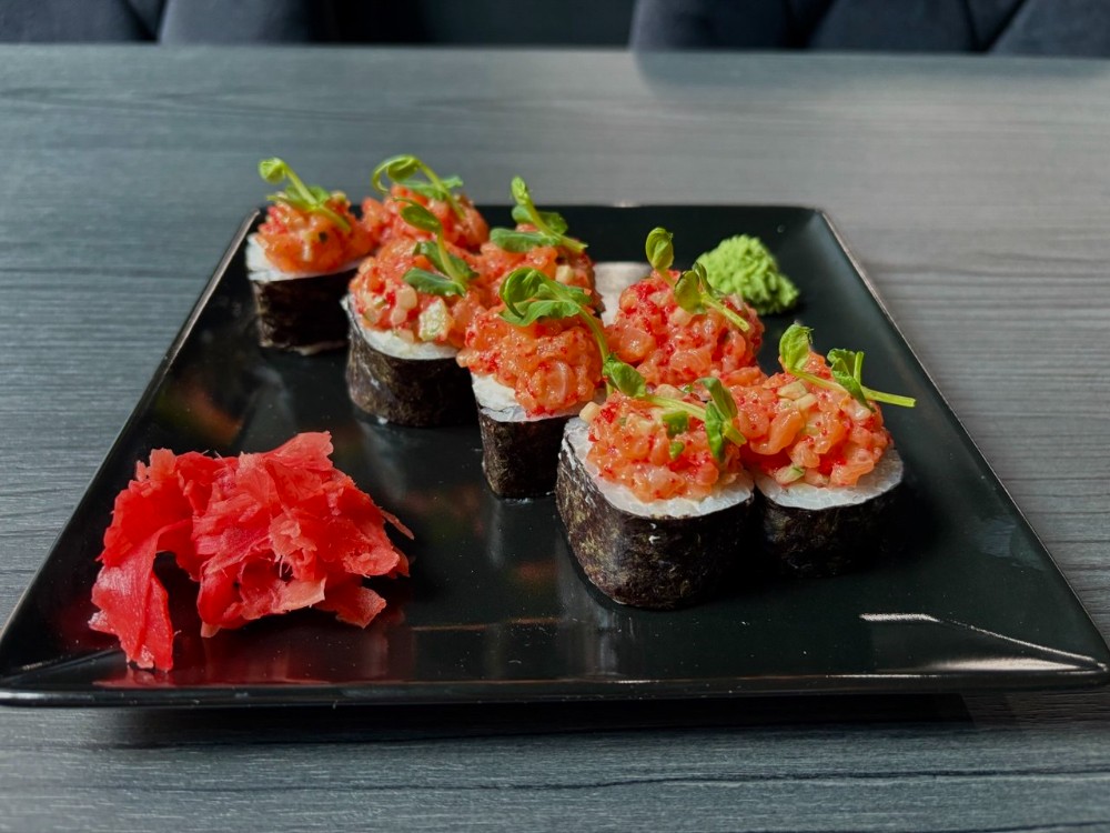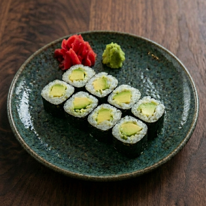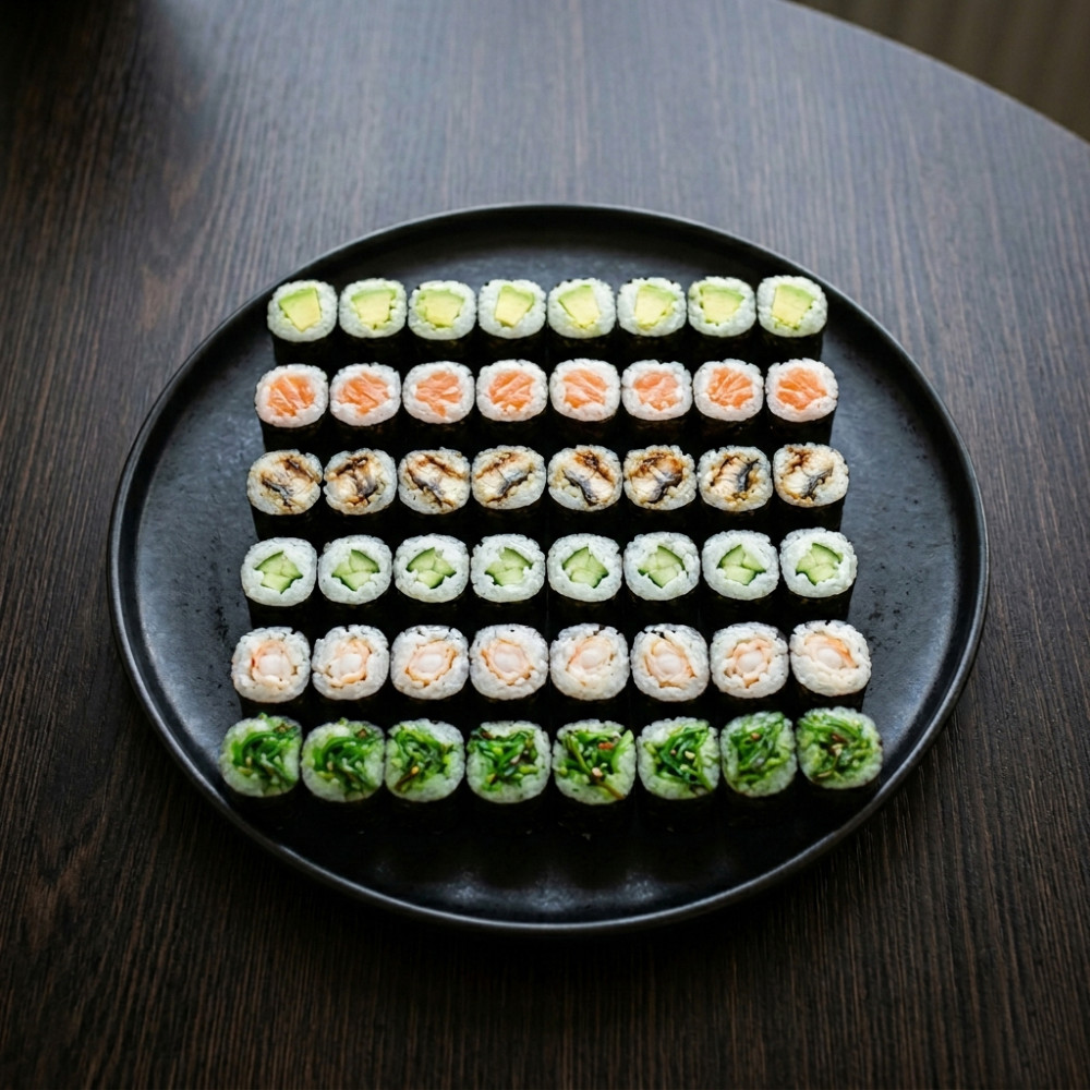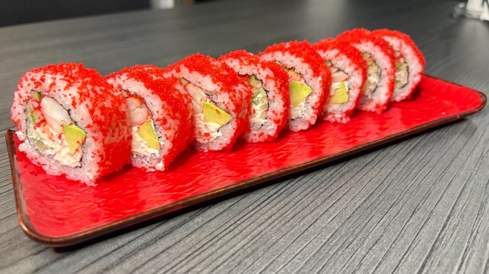 Склад: рис, лосось, авокадо, огірки, крем-сир, чука, соус соєвий, соус горіховий, мікс кунжуту, лимон.