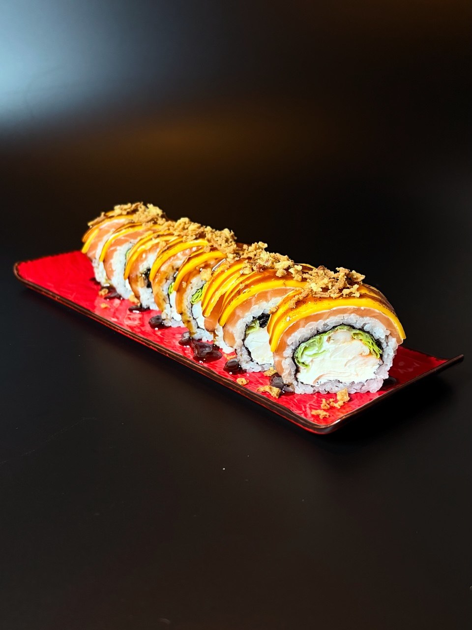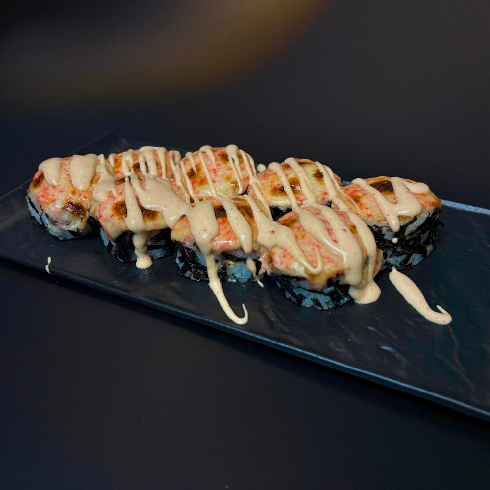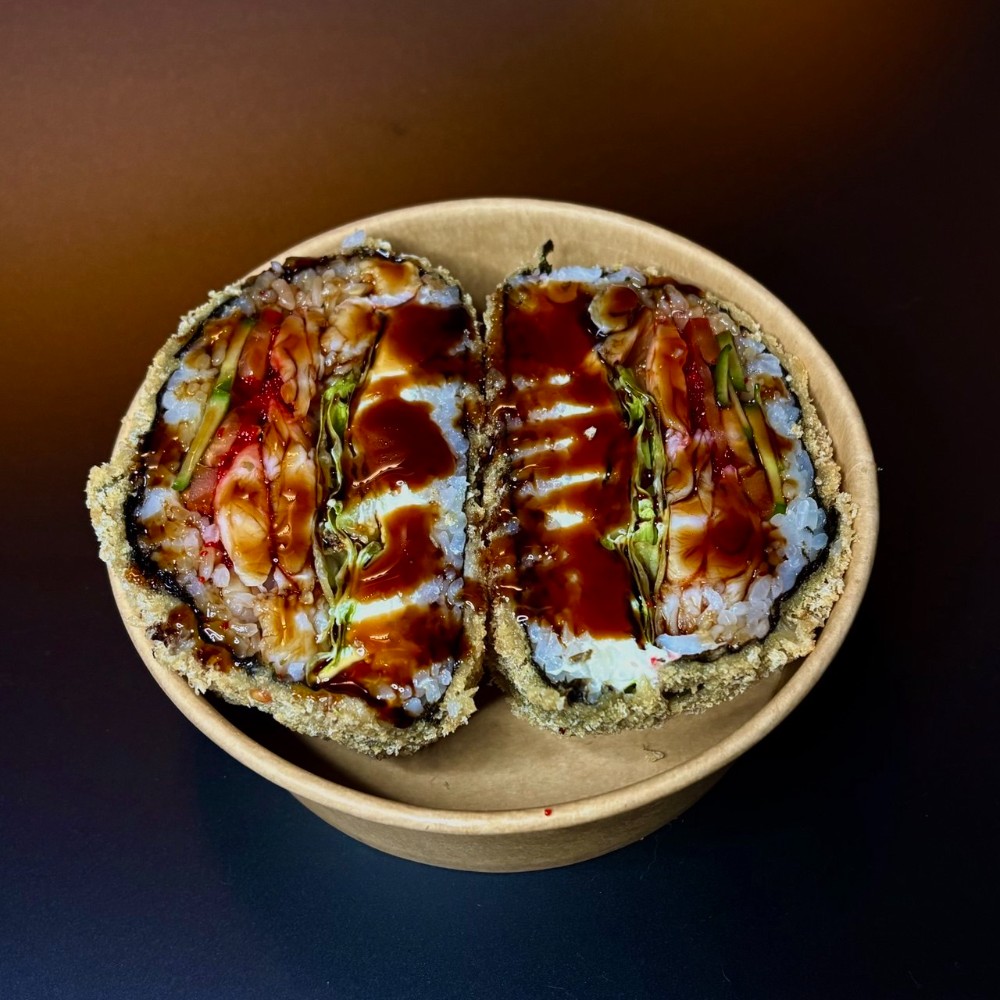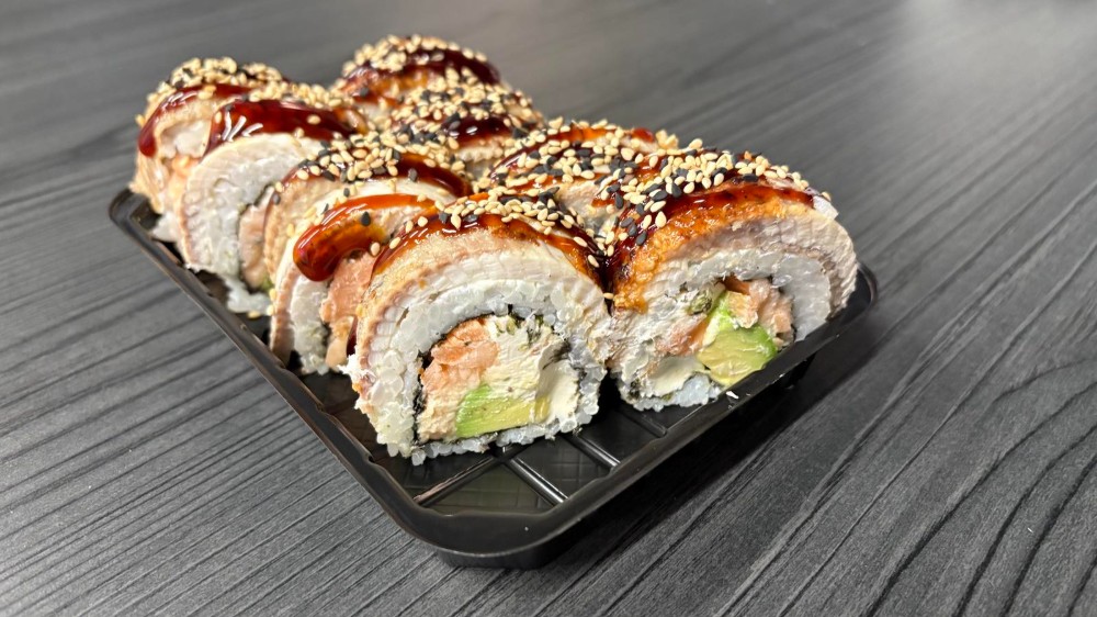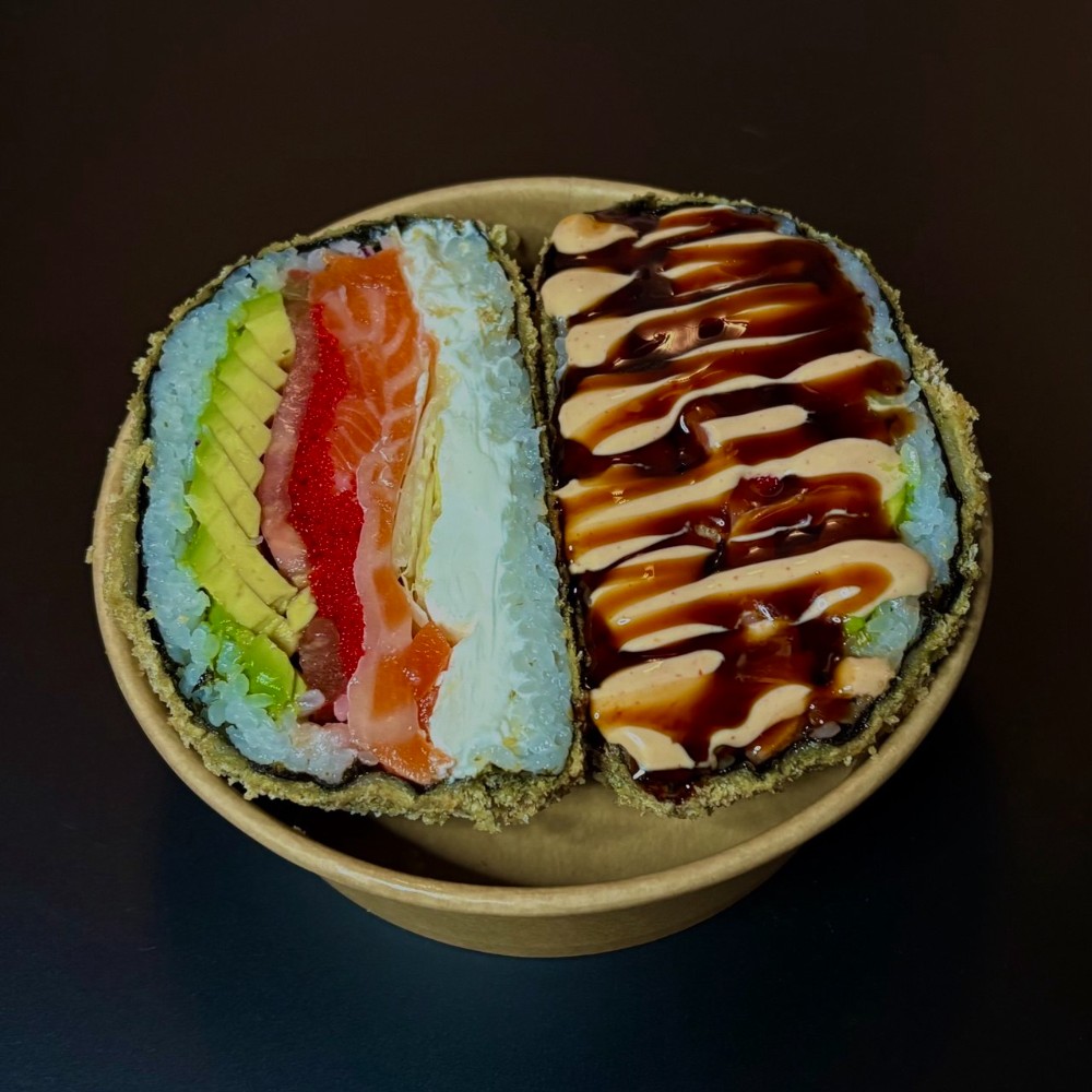 Склад: рис, крем-сир, лосось смажений, авокадо, норі, соус унагі, соус спайсі, мікс салату.