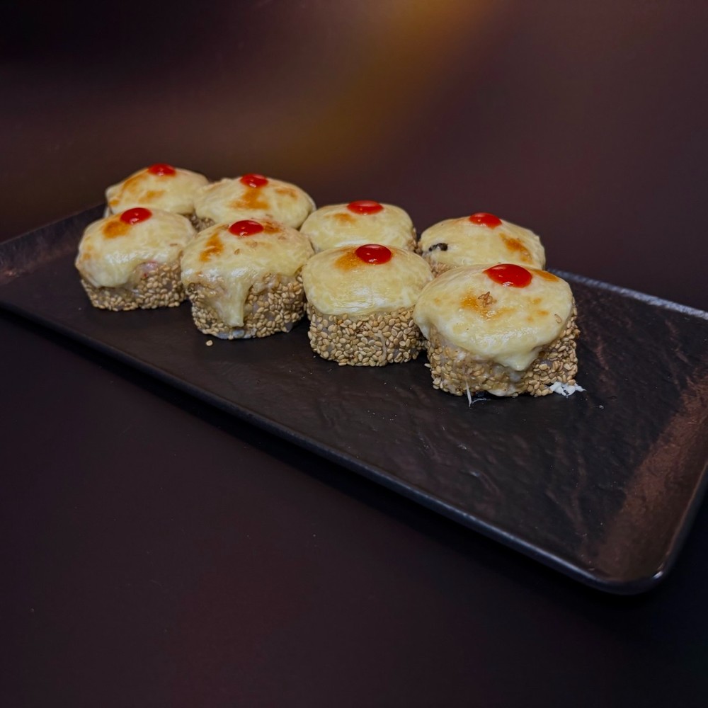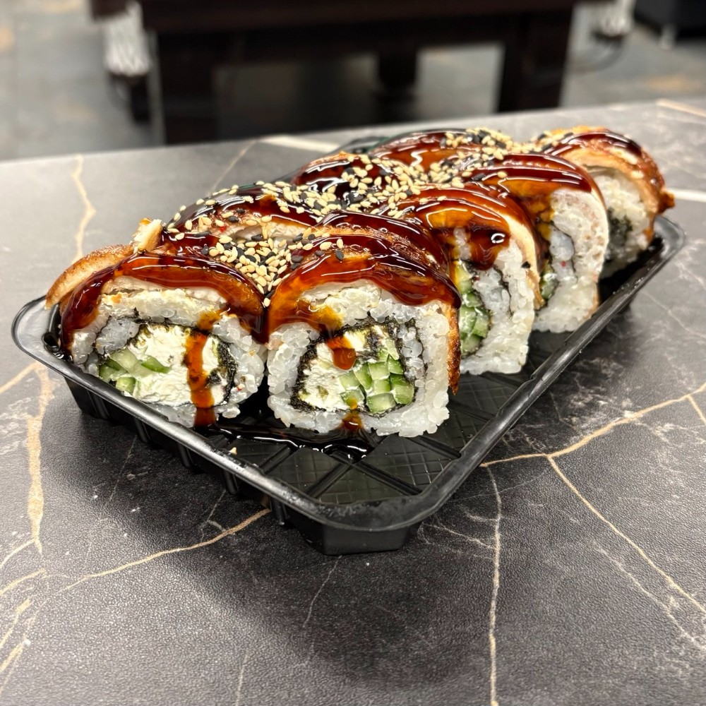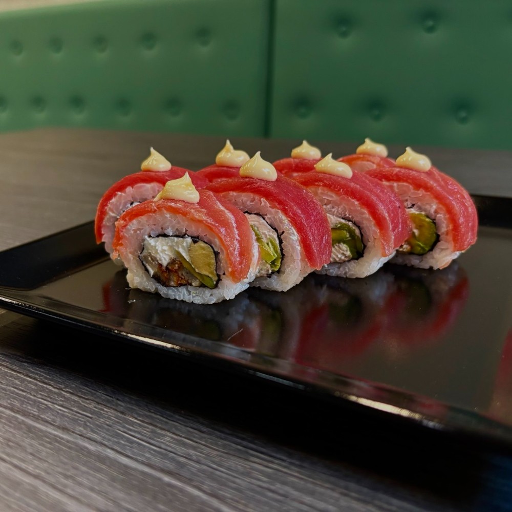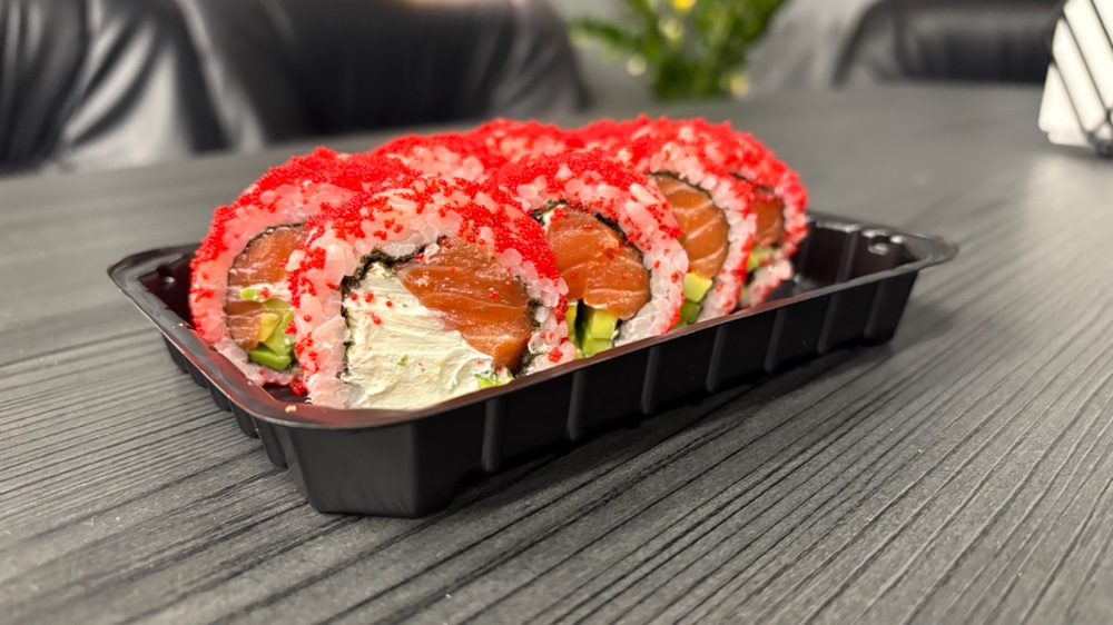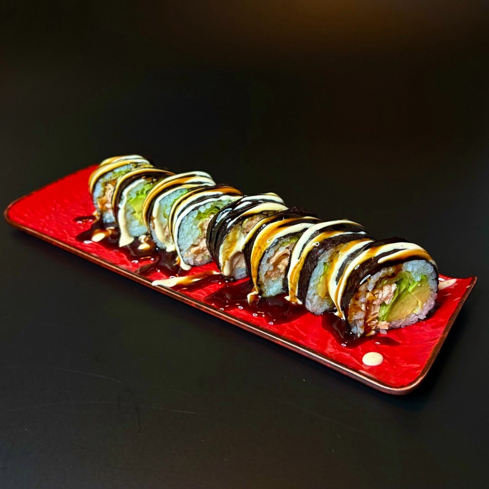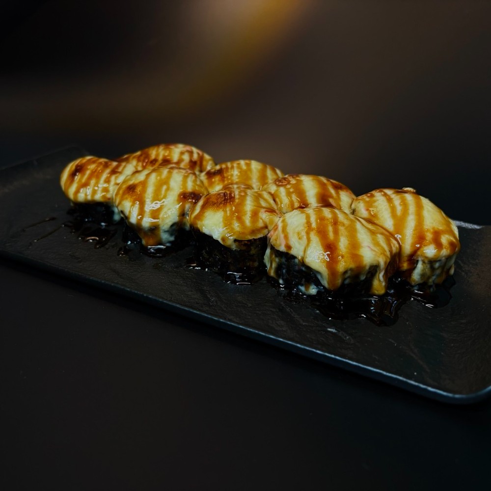 Склад: рис, крем-сир, лосось смажений, авокадо, норі, соус унагі, соус спайсі, мікс салату.