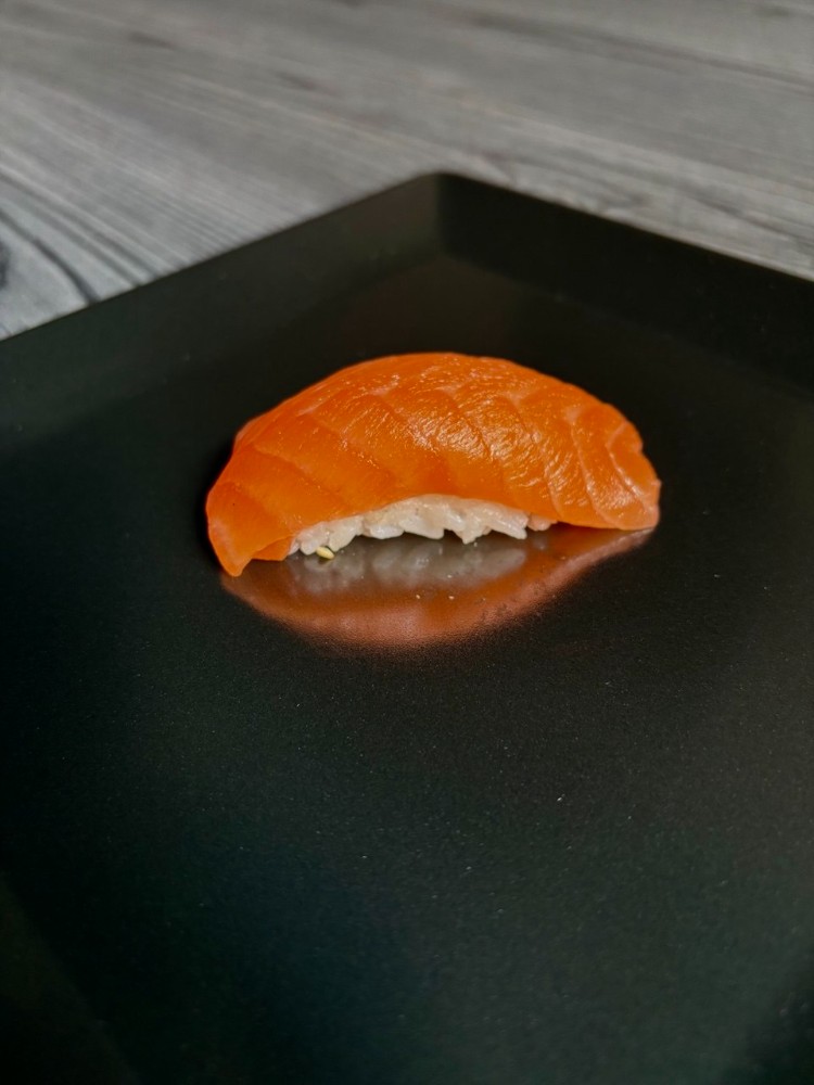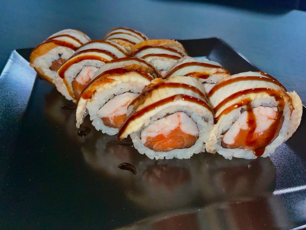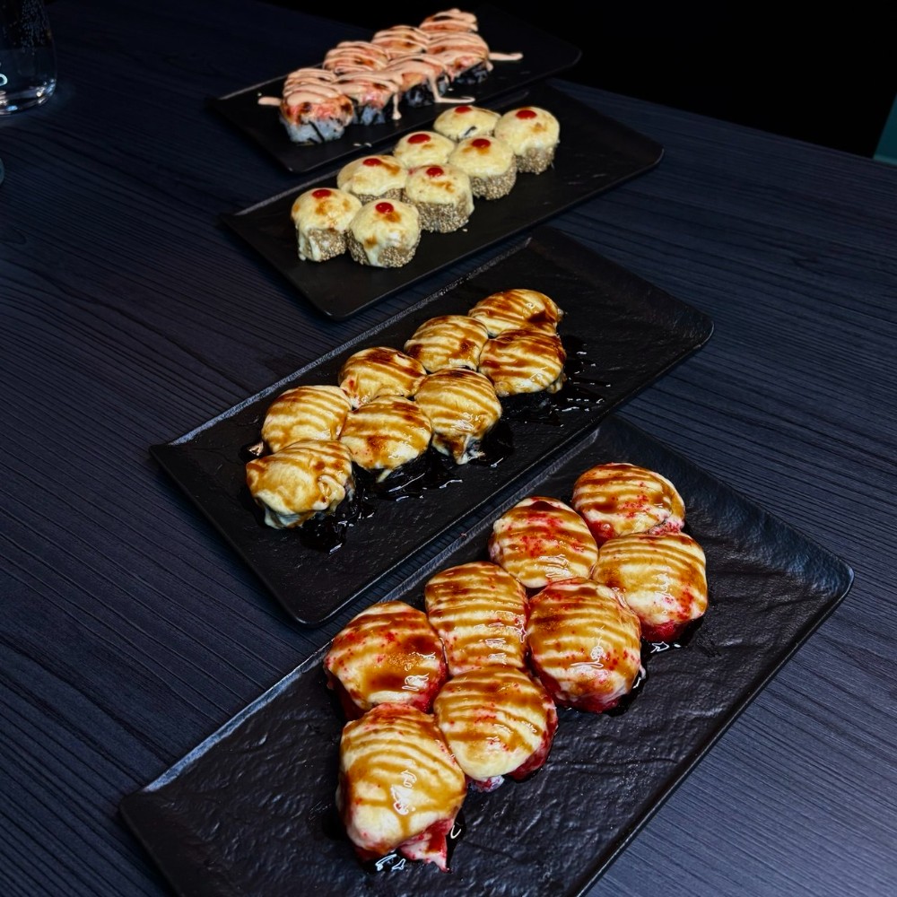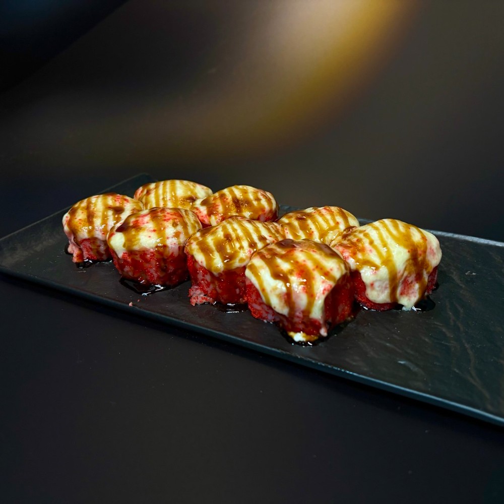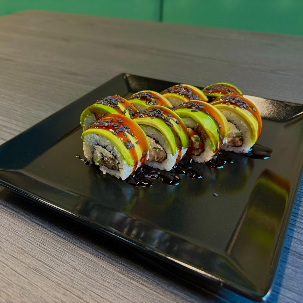 Склад: рис, крем-сир, лосось смажений, авокадо, норі, соус унагі, соус спайсі, мікс салату.