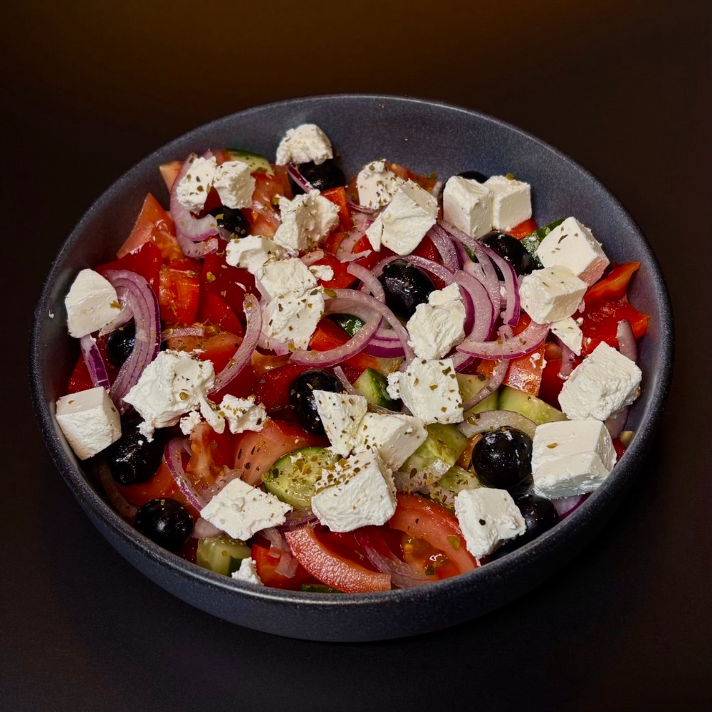 Склад: помідор, огірок, перець болгарський, фета, цибуля синя, маслини, олія оливкова, орегано.