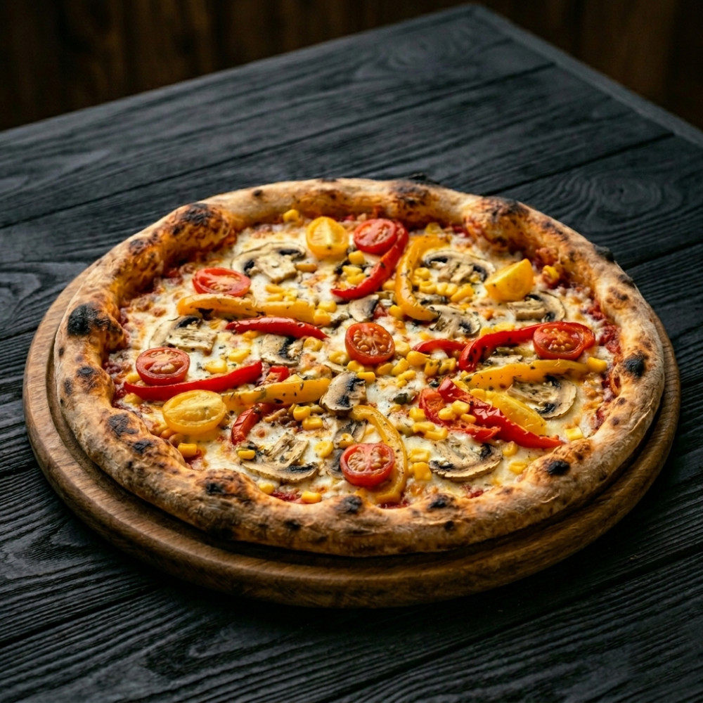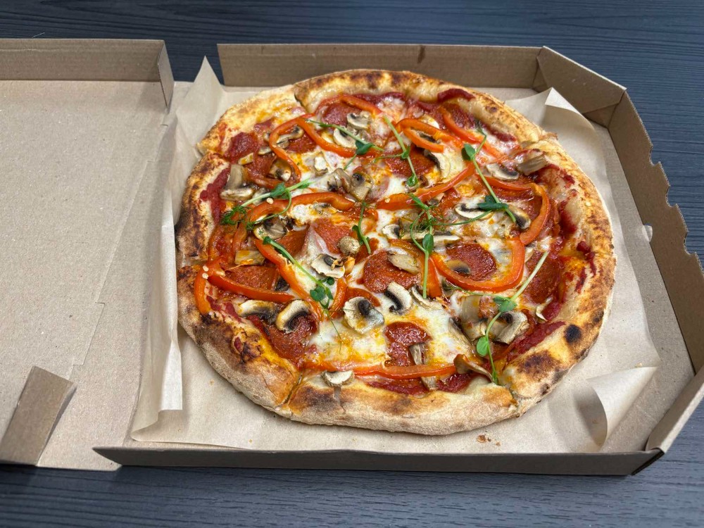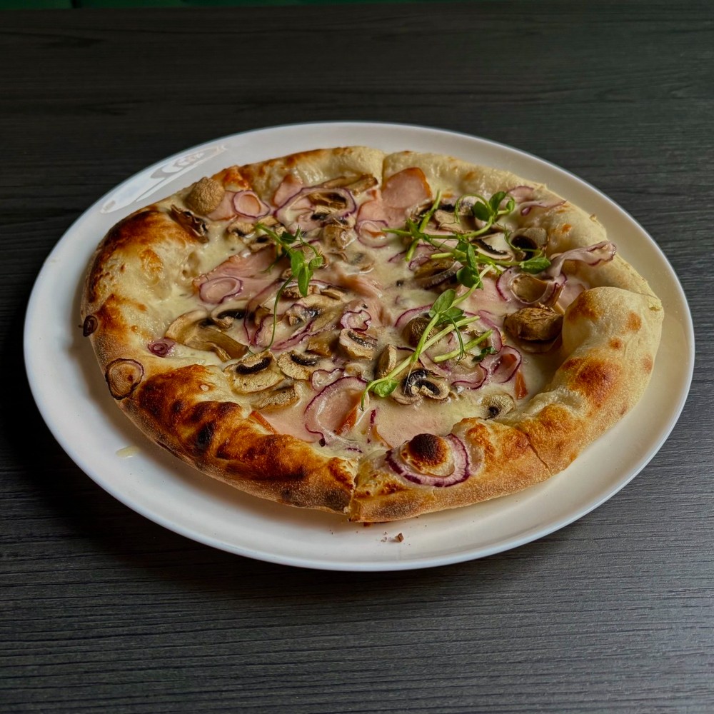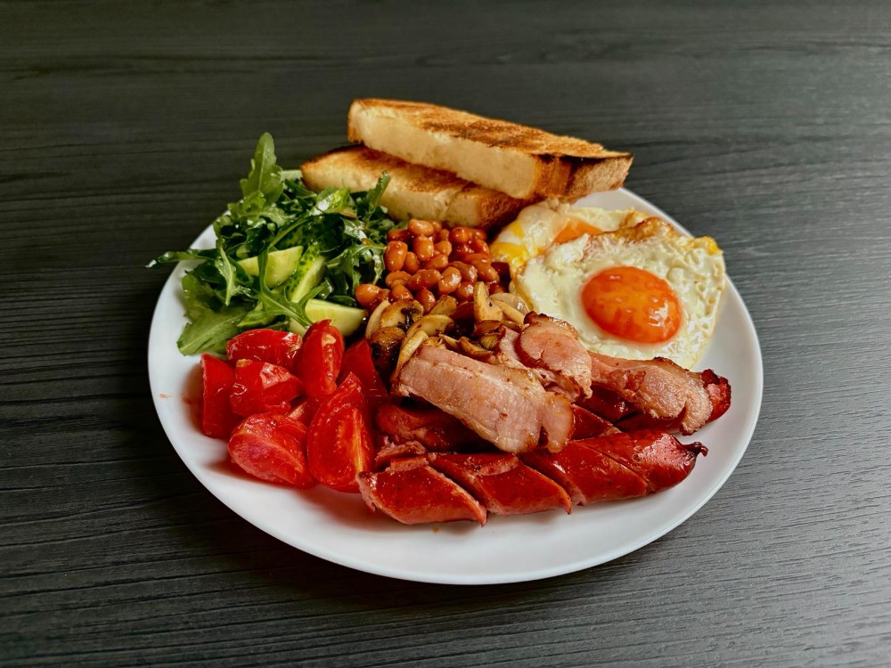 Склад: хліб, яйце, ковбаски мюнхенські,бекон, квасоля, печериці, томати чері, огірок, рукола.