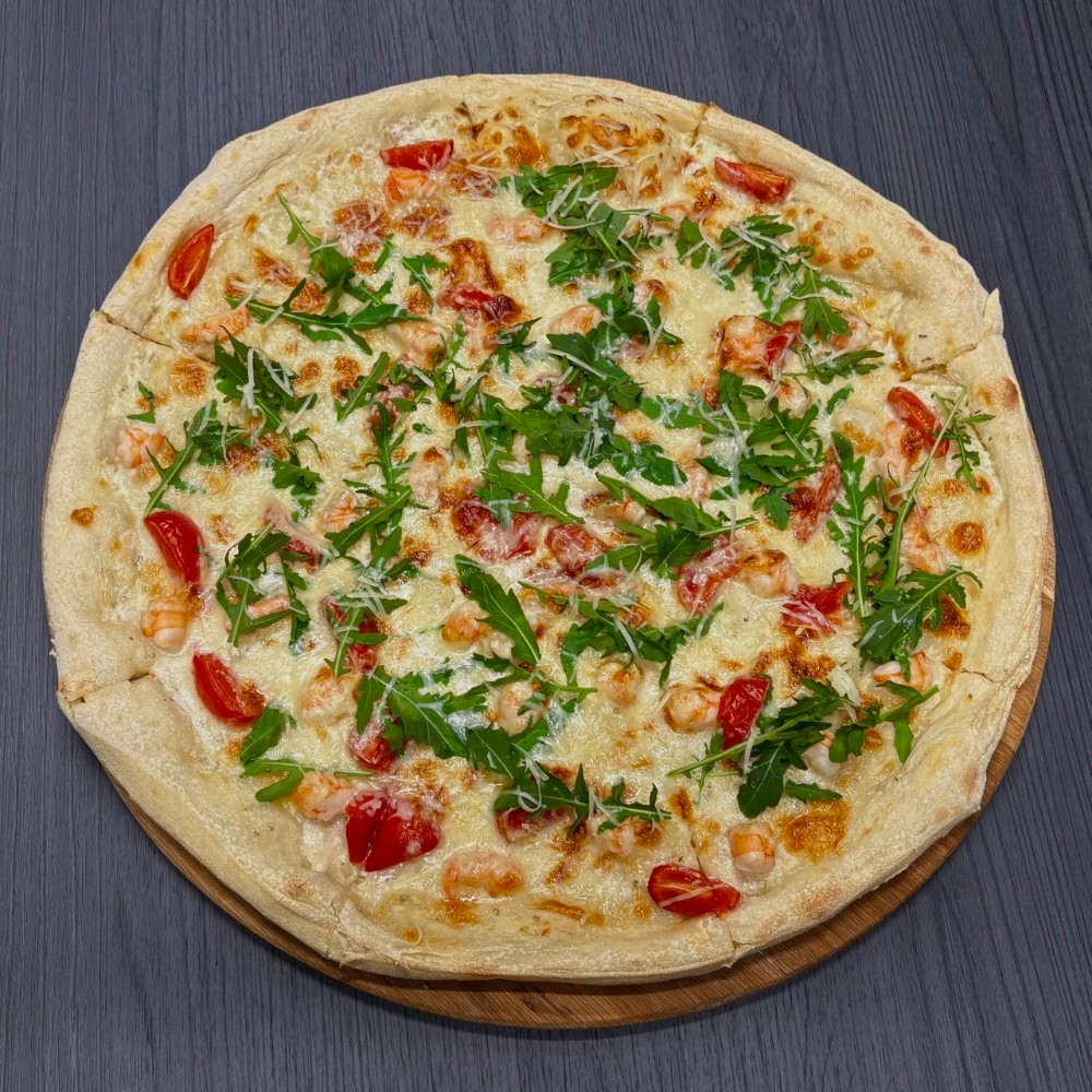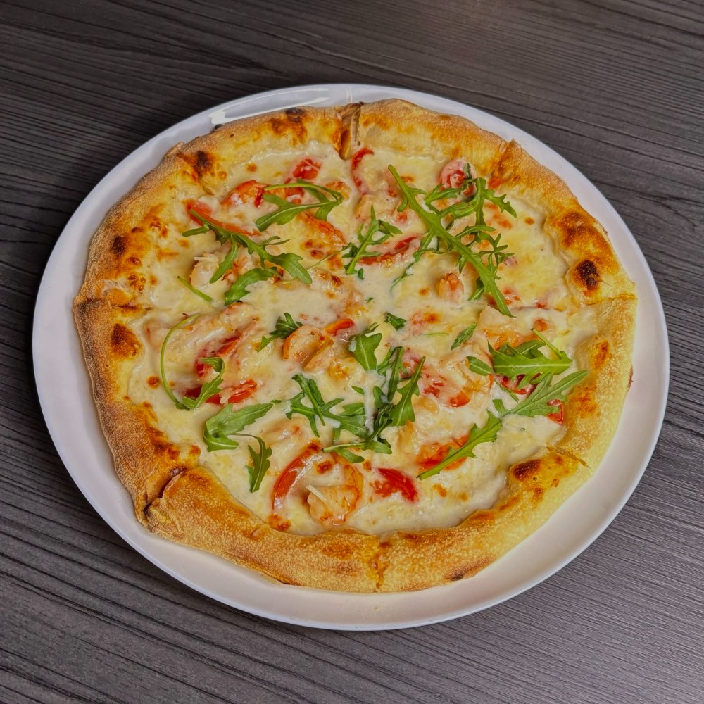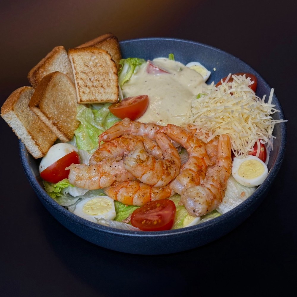 Склад: айсберг, креветка тигрова, томати чері, перепелине яйце, грінки, соус Цезар, сир Пармезан, олія оливкова.
