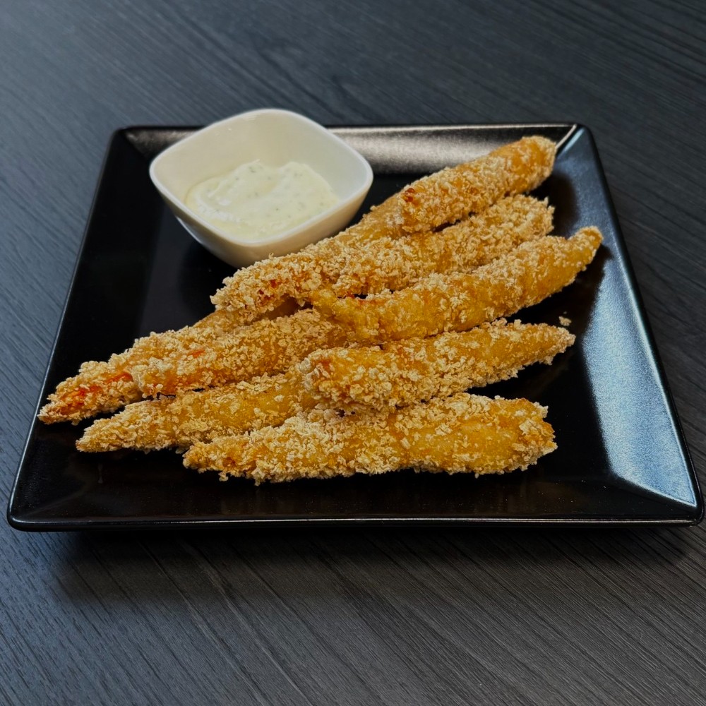 Склад: креветка тигрова, кляр, сухарі Панко, соус часниковий.