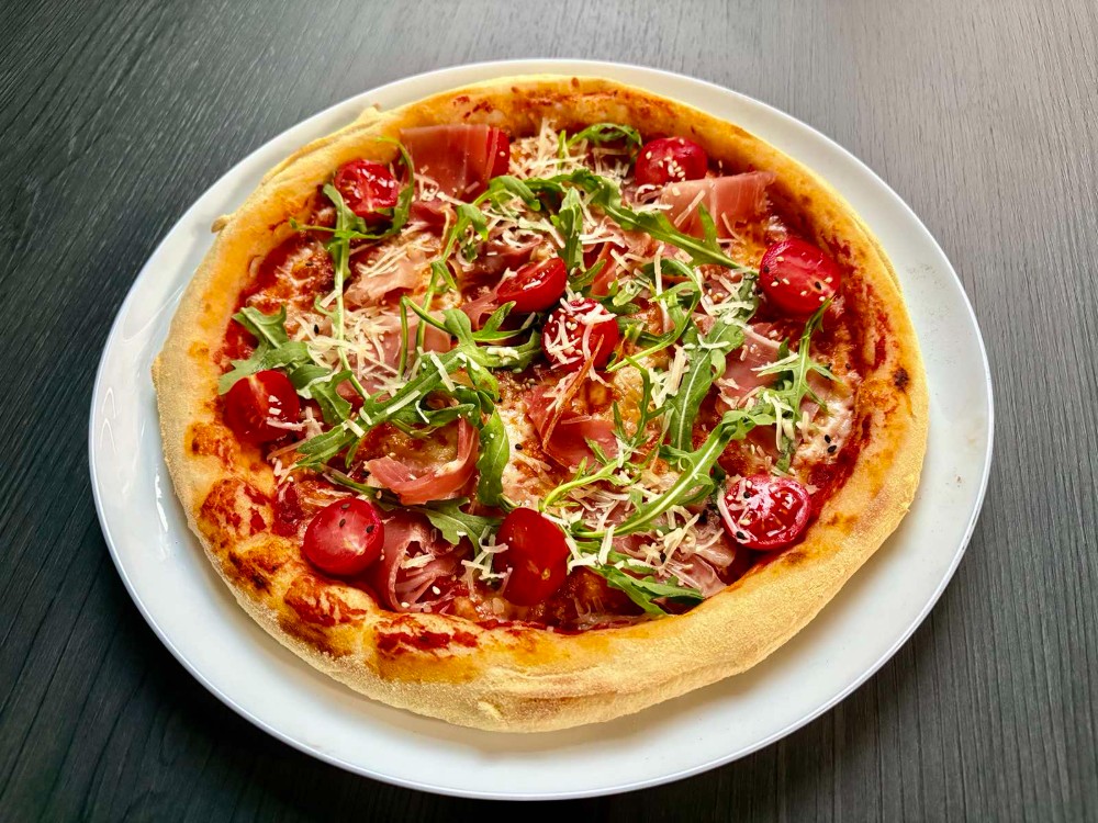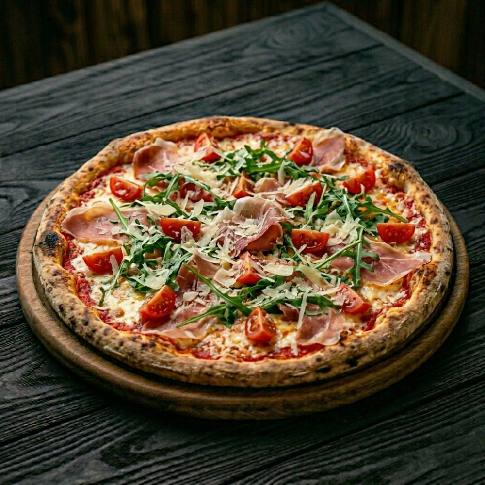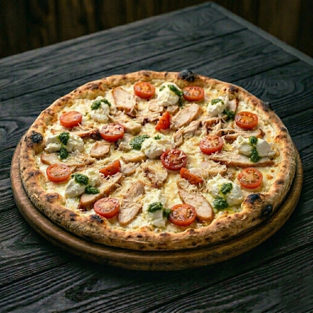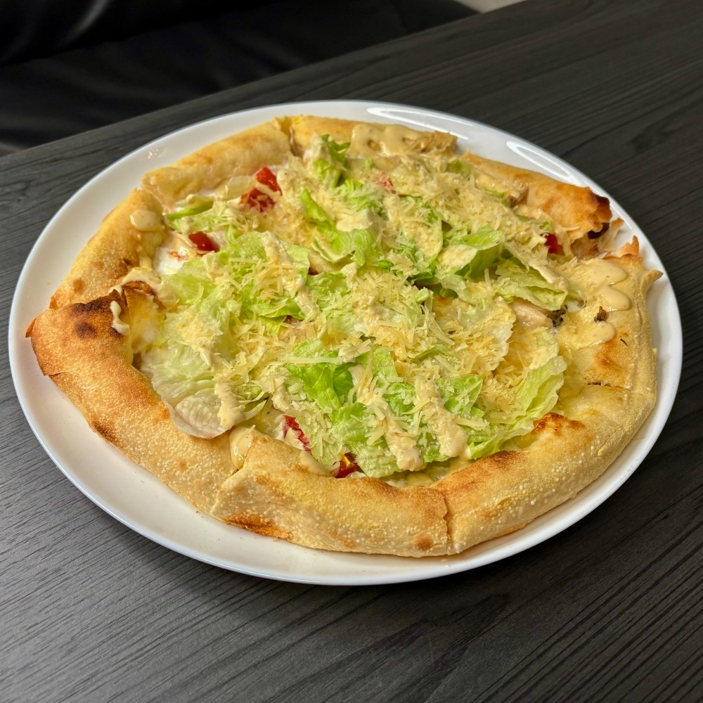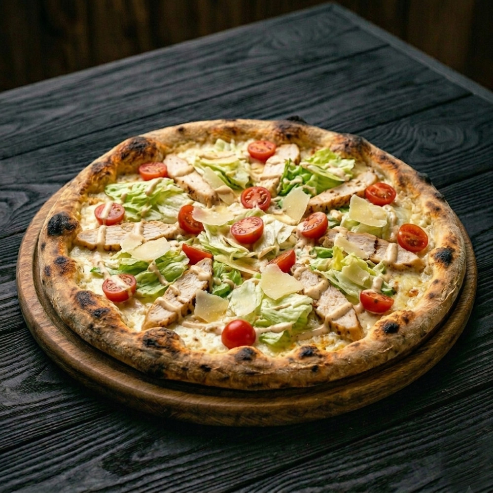 Склад: айсберг, філе куряче, томати чері, перепелине яйце, бекон, грінки, соус Цезар, сир Пармезан, олія оливкова.