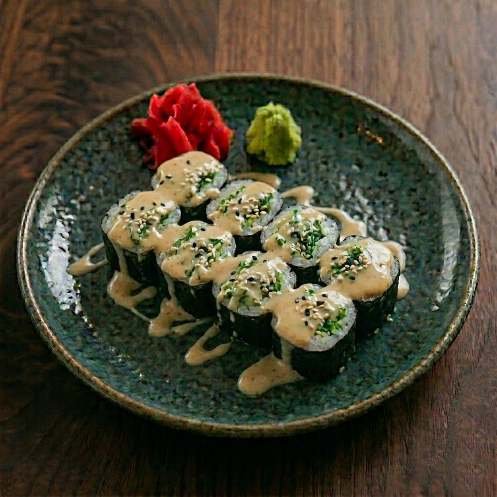 Склад: рис, чука, норі, соус горіховий, кунжут.