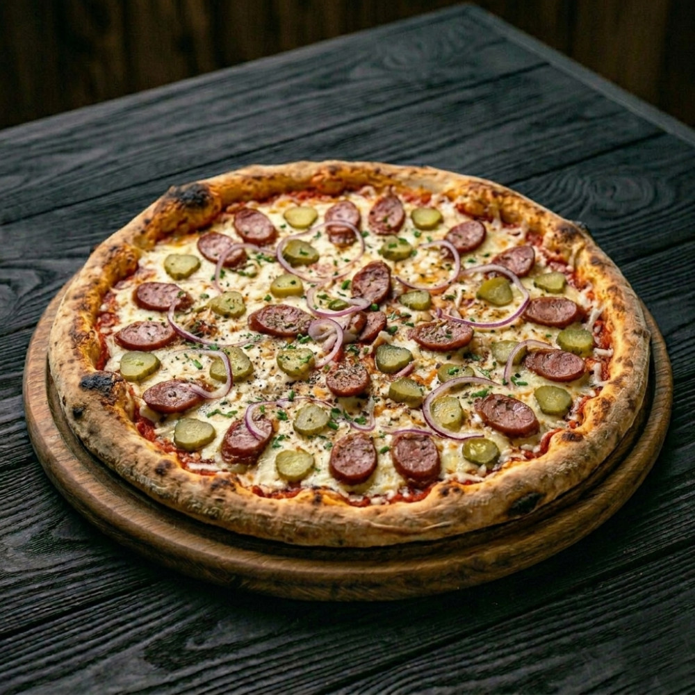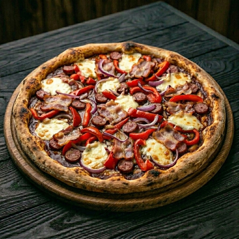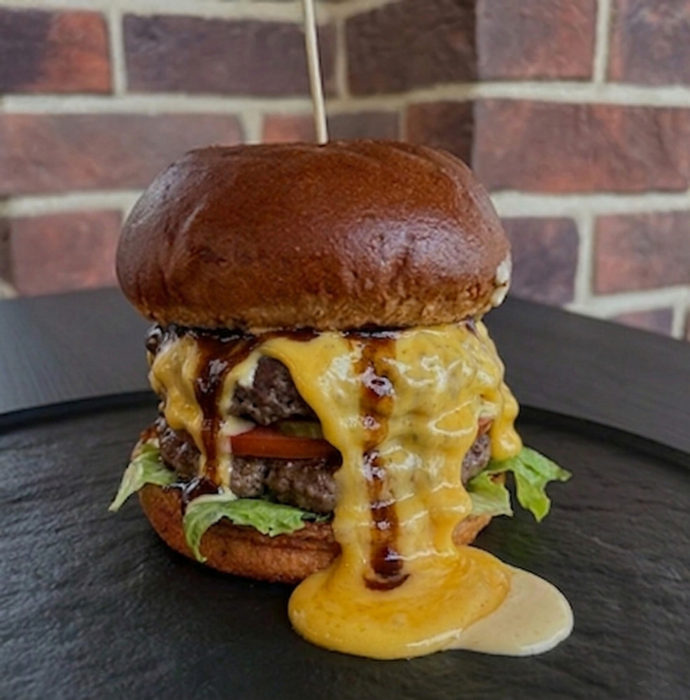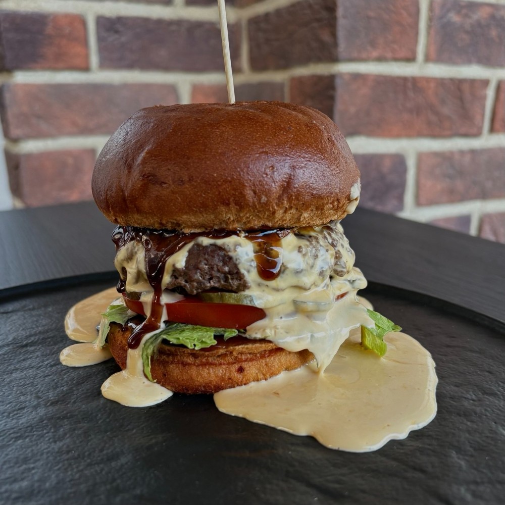Склад: котлета яловича, булка Бріош, бекон, айсберг, помідор, цибуля кранч, соус BBQ, сирна лава.