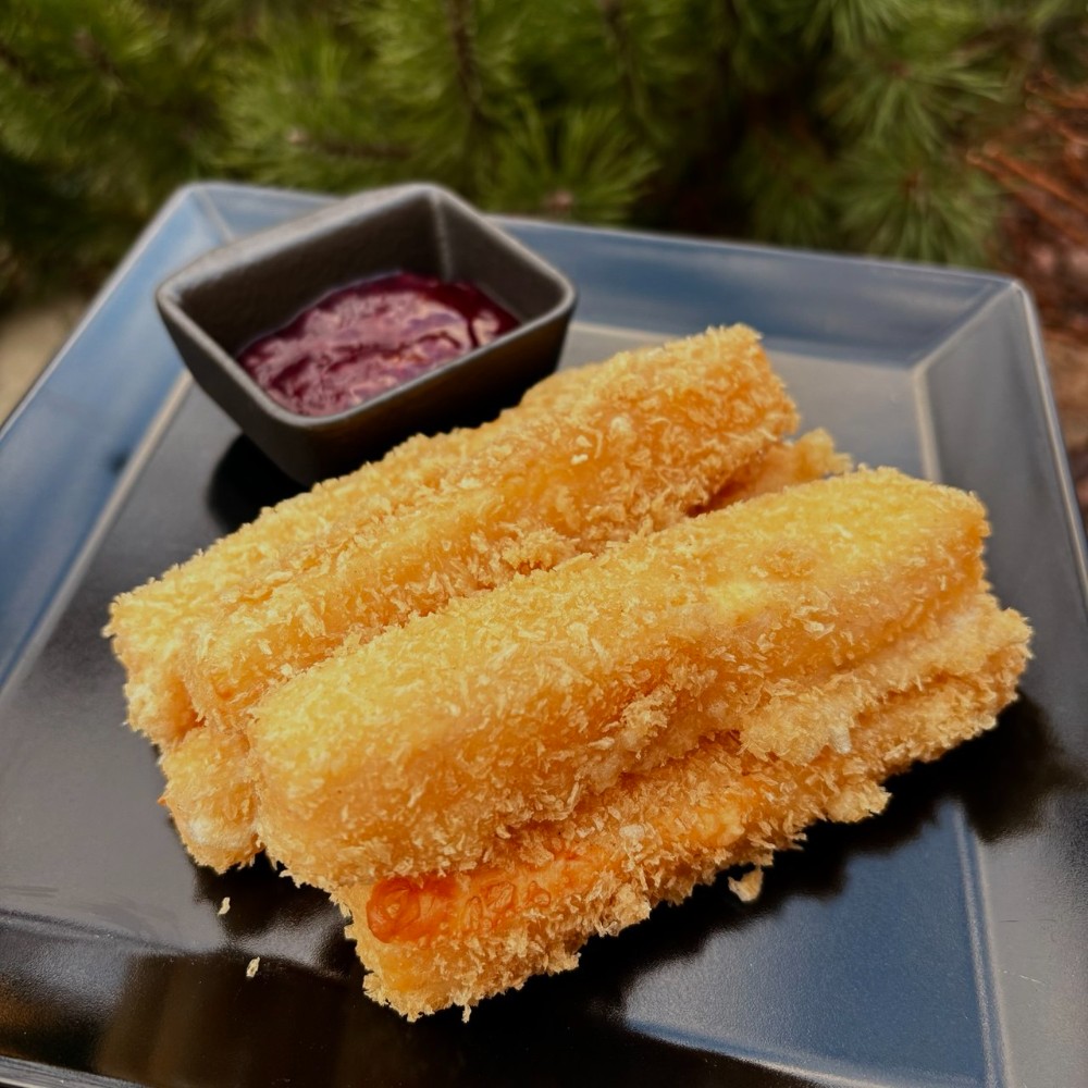 Склад: сир Гауда, кляр, сухарі Панко, соус журавлиново-брусничний.