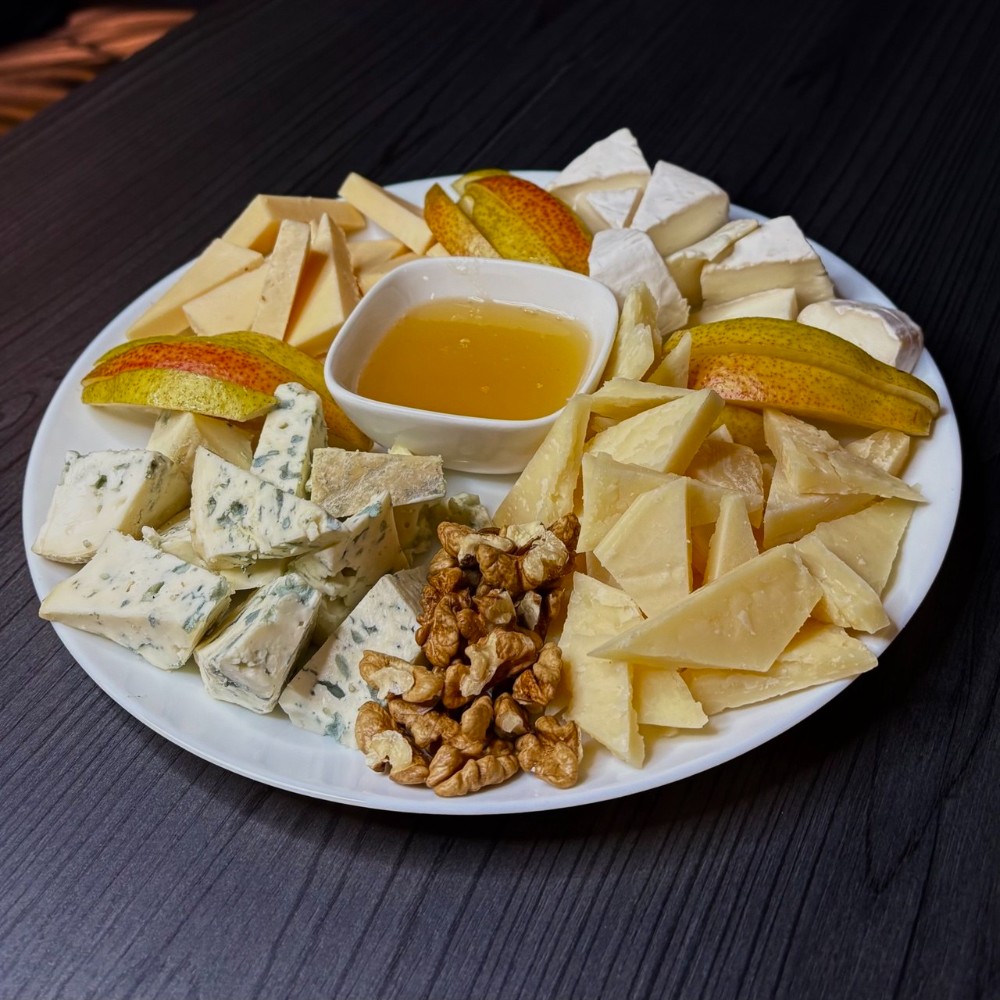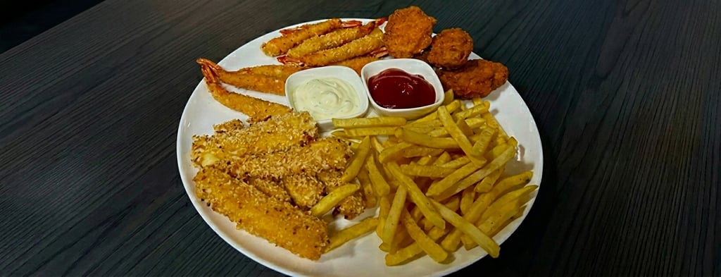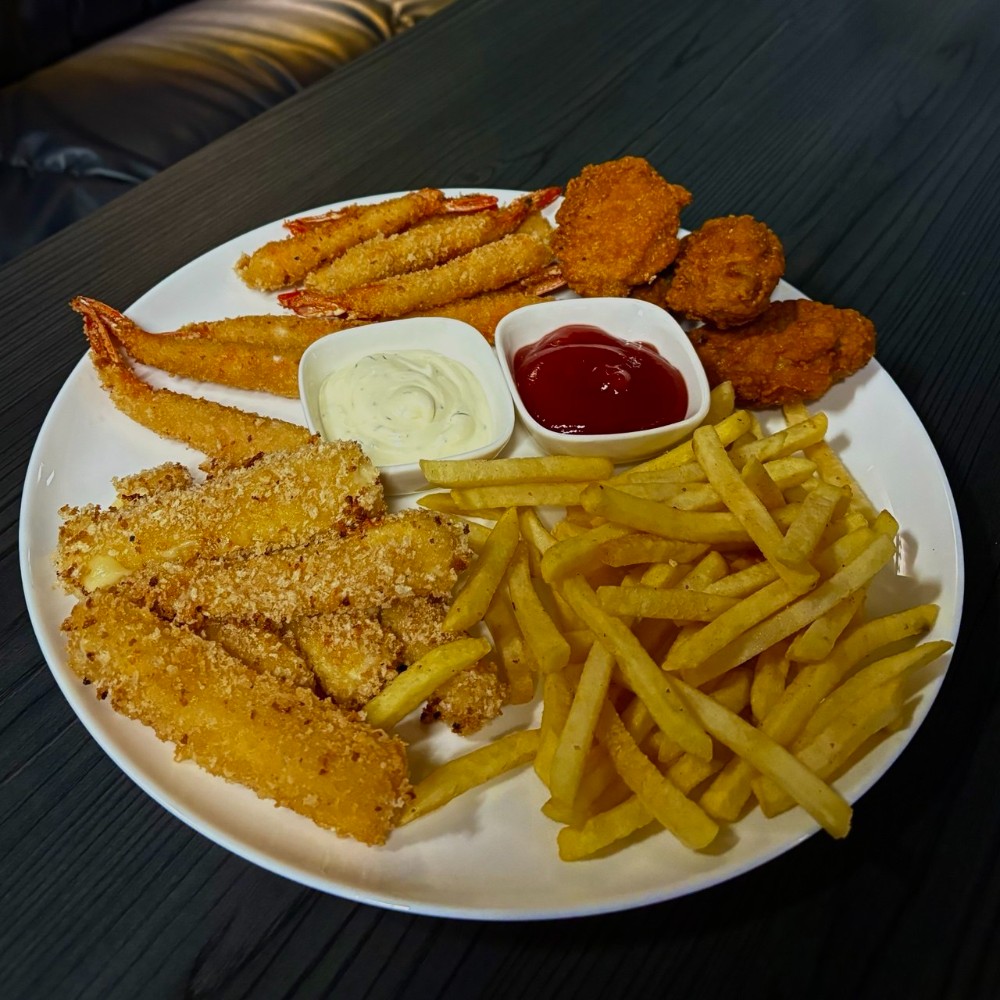 Склад: креветка в темпурі, сирні палички, крило куряче, картопля фрі, соус часниковий, кетчуп.