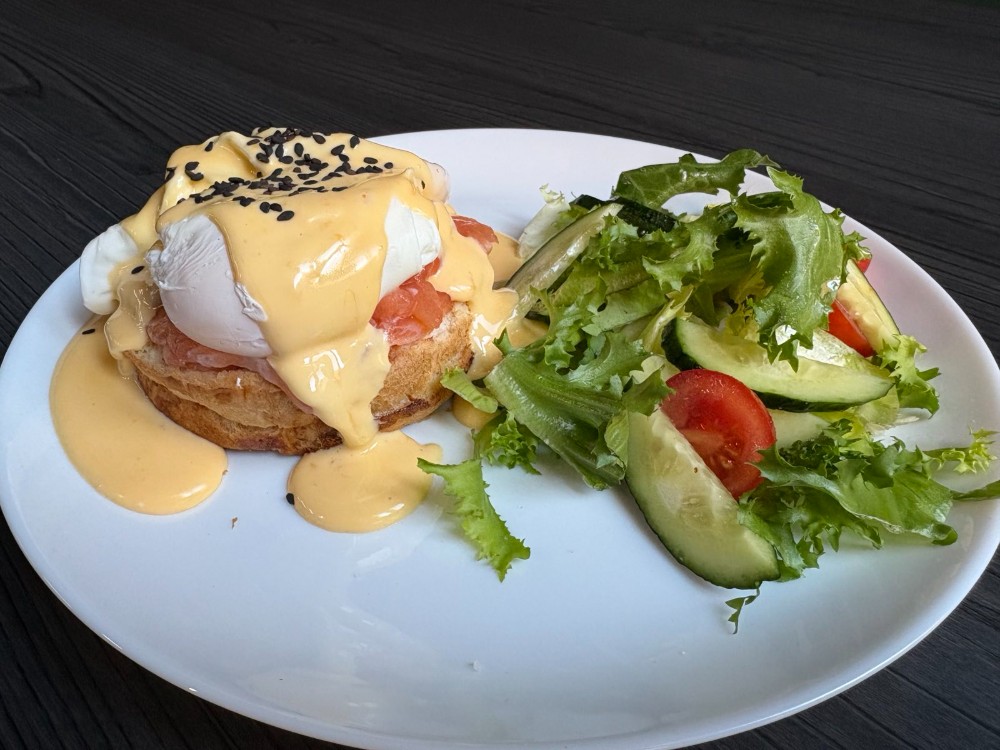 Склад: булка Бріош, яйце, лосось, вершки, чедер, огірок, томати чері, мікс салату, кунжут.