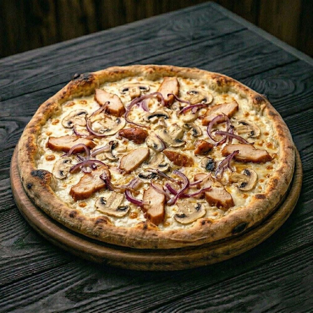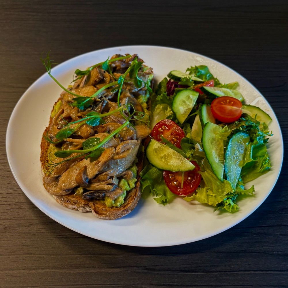 Склад: хліб подовий, авокадо, філе куряче, печериці, вершки, мікс салату, огірок, томати чері, цибуля синя, соєвий соус.