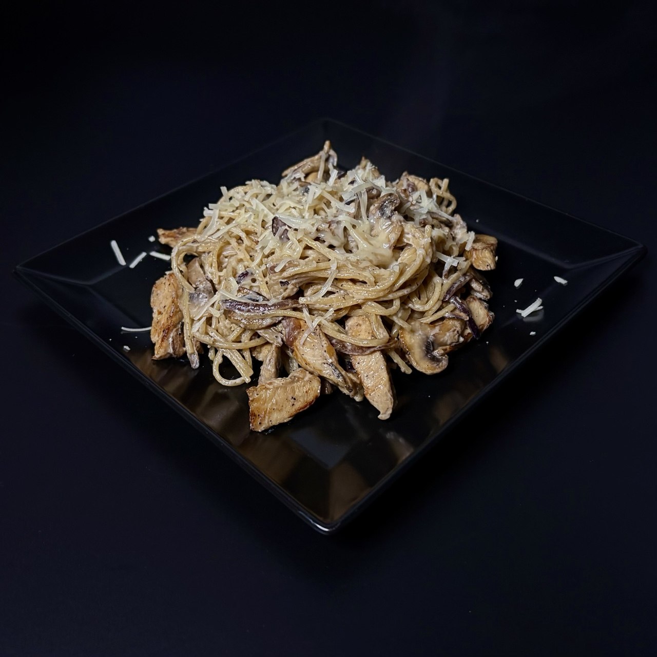 Склад: макарони, філе куряче, печериці, вершки, цибуля синя, сир Пармезан, сіль перець.