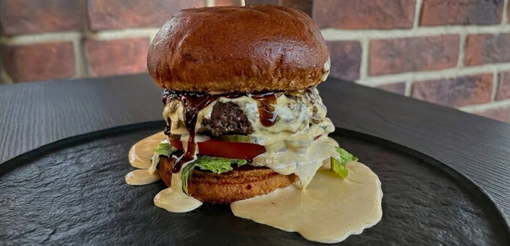 Склад: котлета яловича, булка Бріош, айсберг, помідор, цибуля кранч, соус BBQ, сирна лава.